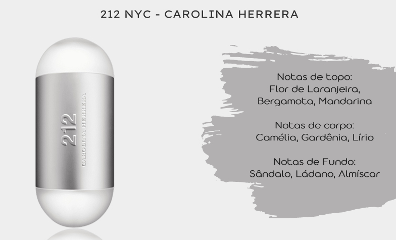 O perfume 212 NYC de Carolina Herrera é mais um floral do nosso elenco. Desde o seu lançamento lá em 1997, esse perfume se tornou a assinatura de muito gente por aí. Com sua fragrância inspirada na Nova York dos anos 90, é um perfume vibrante e sedutor. Ele abre com uma flor de laranjeira bem presente e depois vem apresentando seu toque de Lírio, Gardênia e Almíscar. Vai muito bem nos dias quentes, já que não é aquele floralzão mais carregado. É um Eau de Toilette bastante elogiado pela sua projeção e longevidade.